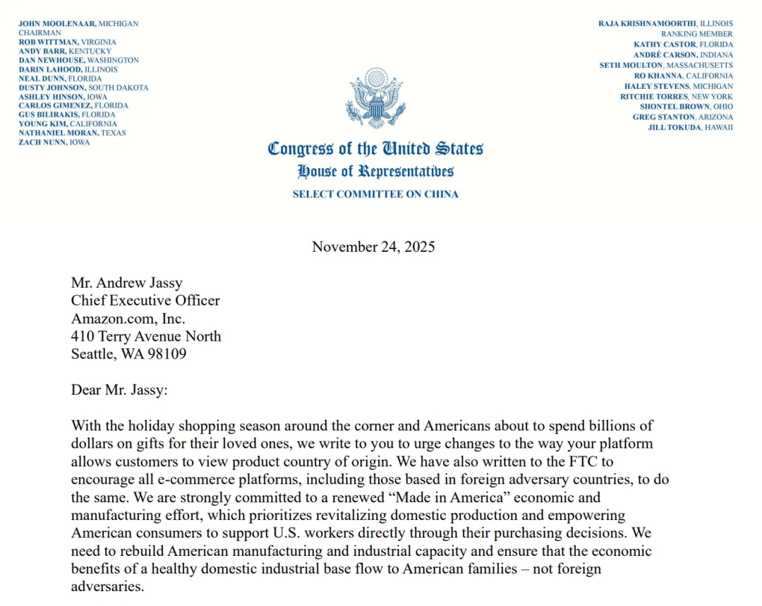 AMZ123获悉,据外媒报道,近日,美国众议院美中战略竞争特别委员会向亚马逊及美国联邦贸易委员会(FTC)致函,要求亚马逊乃至所有电商平台在其销售的商品上标明原产地,并为此设定了明确的时间节点:亚马逊需在12月15日前以书面形式提交答复,并说明执行计划。
